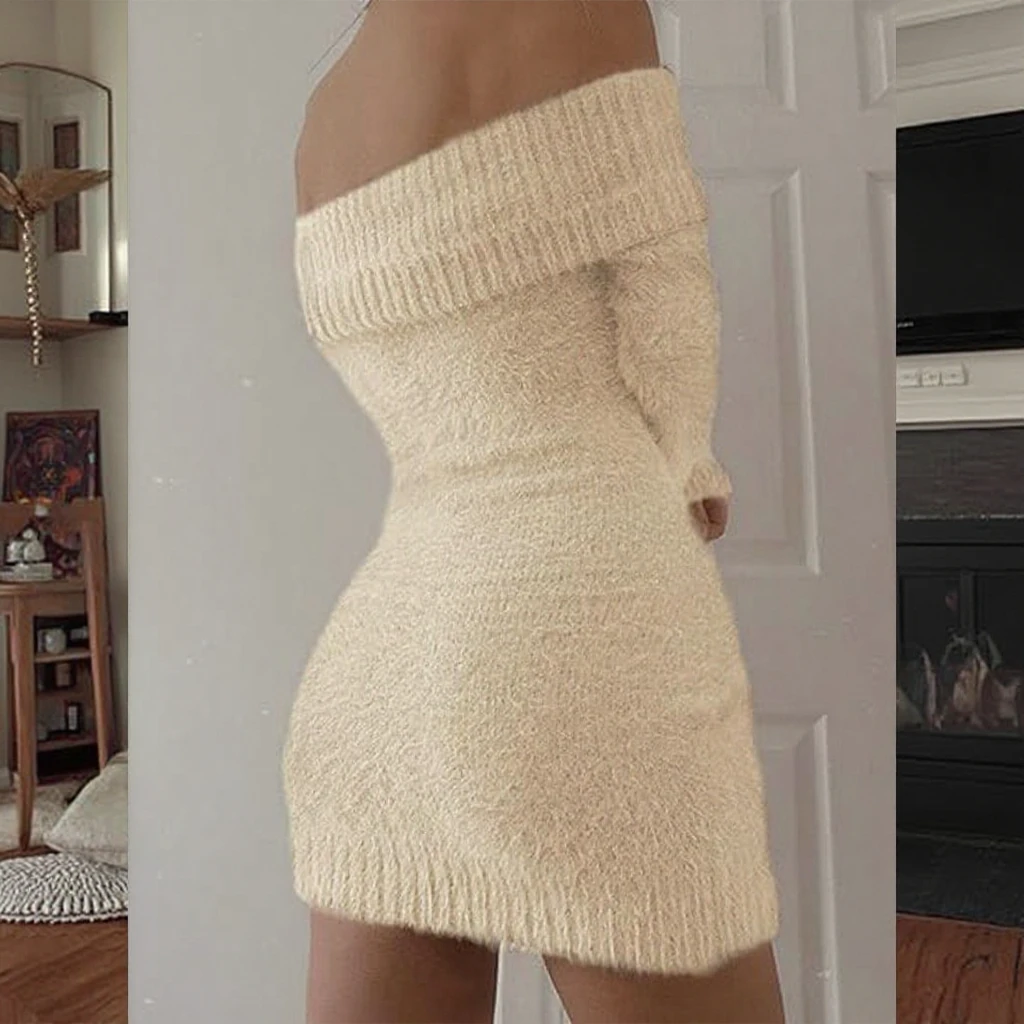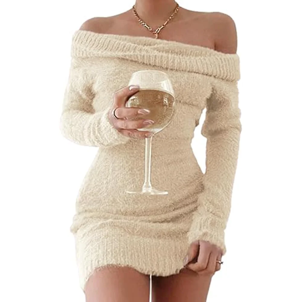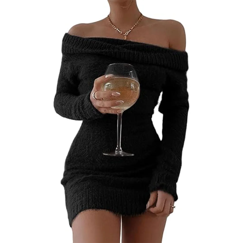 Custom 2025 Women's Off-shoulder Long Sleeve Bodycon Pullover Mini Dress Ribbed Knit Sexy Party Short Knitted Dress for Solid